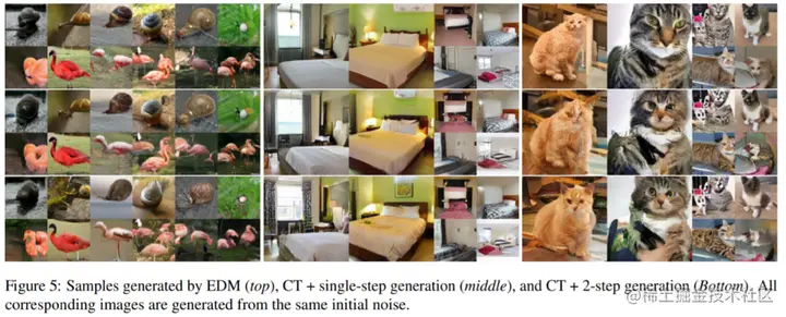 图 5 提供了 EDM (Karras et al., 2022) 样本(顶部)、single-step CT 样本(中)和 two-step CT 样本(底部)。