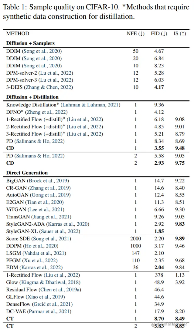 表 1 和表 2 表明 CT( consistency training ) 在 CIFAR-10 上的表现优于所有 single-step、非对抗性生成模型,即 VAE 和归一化流。此外,CT 在不依赖蒸馏的情况下获得与 PD ( progressive distillation )相当的质量,用于 single-step 生成。