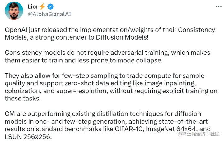 有网友将其视为扩散模型的有力竞争者!并表示 Consistency Models 无需对抗性训练,这使得它们更容易训练,不容易出现模式崩溃。