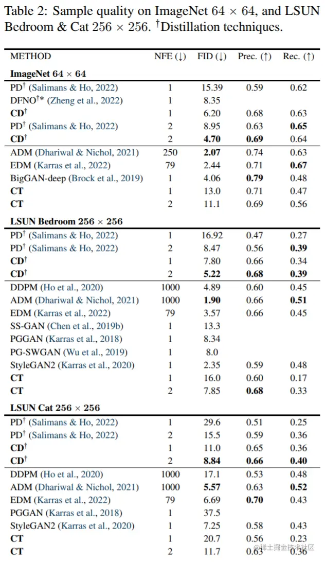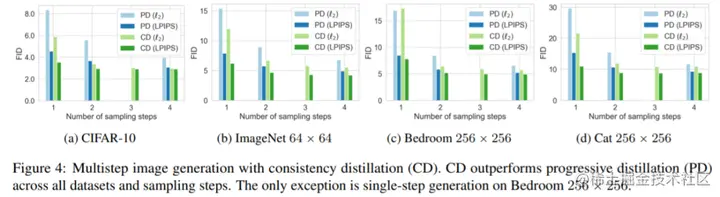研究团队通过实验证明 Consistency Models 在 one-step 和 few-step 生成中优于现有的扩散模型蒸馏方法。例如,在 one-step 生成方面,Consistency Models 在 CIFAR-10 上实现了新的 SOTA FID 3.55,在 ImageNet 64 x 64 上为 6.20。当作为独立生成模型进行训练时,Consistency Models 在 CIFAR-10、ImageNet 64 x 64 和 LSUN 256 x 256 等标准基准上的表现也优于 single-step、非对抗生成模型。
