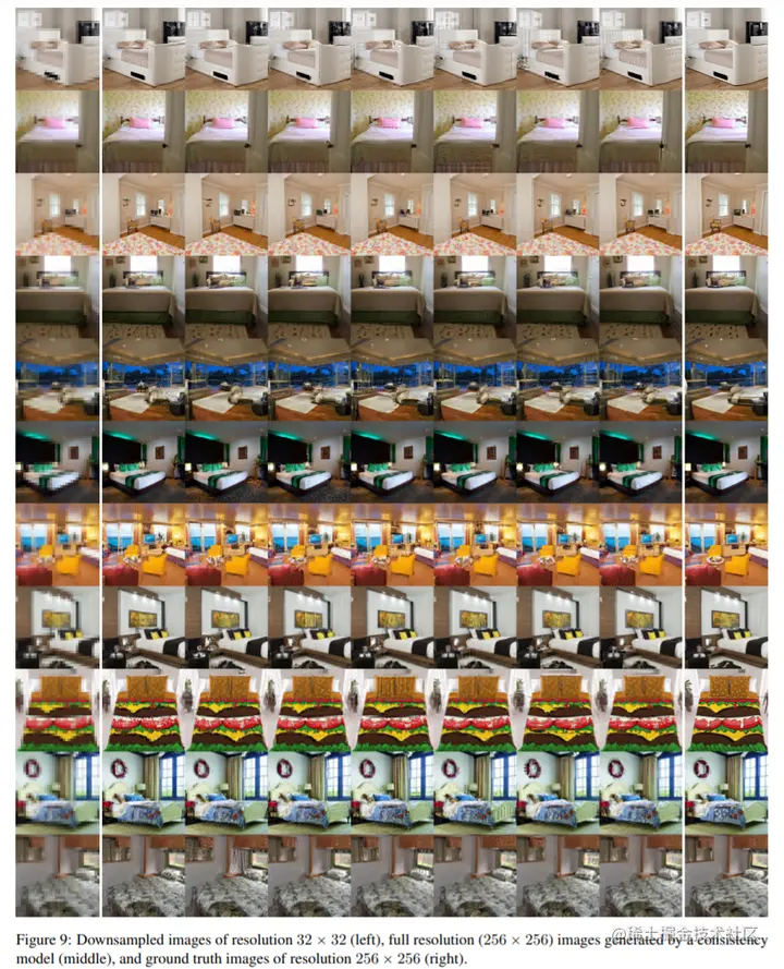 Consistency Model 生成高分辨率图像:左侧为分辨率 32 x 32 的下采样图像、中间为 Consistency Model 生成的 256 x 256 图像,右边为分辨率为 256x 256 的真值图像。相比于初始图像,Consistency Model 生成的图像更清晰。