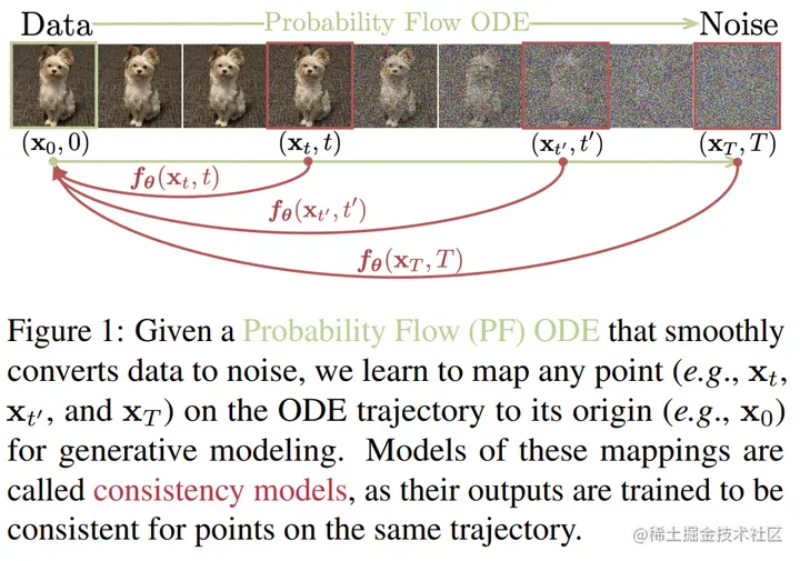 首先 Consistency Models 建立在连续时间扩散模型中的概率流 (PF) 常微分方程 (ODE) 之上。如下图 1 所示,给定一个将数据平滑地转换为噪声的 PF ODE,Consistency Models 学会在任何时间步(time step)将任意点映射成轨迹的初始点以进行生成式建模。Consistency Models 一个显著的特性是自洽性(self-consistency):同一轨迹上的点会映射到相同的初始点。这也是模型被命名为 Consistency Models(一致性模型)的原因。