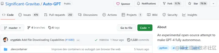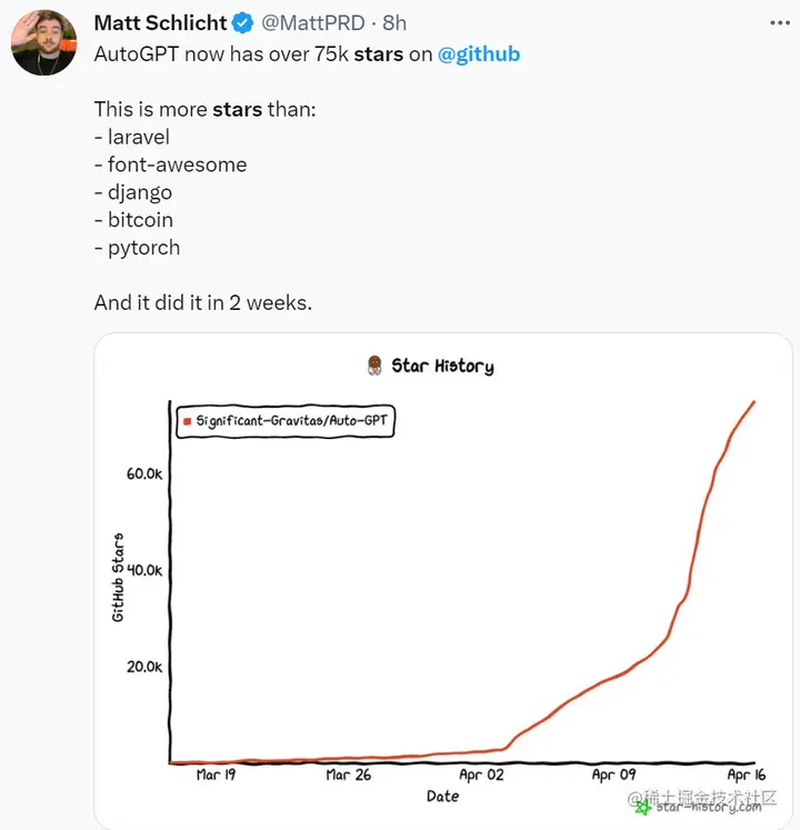 一个示例看下来,AutoGPT 已经能够自己上网查资料、使用第三方工具、操作你的电脑。从上线以来,项目热度不减,截至今天,AutoGPT 的 GitHub Star 量达到 78k,马上接近 80k,超过了 PyTorch 的 65k。