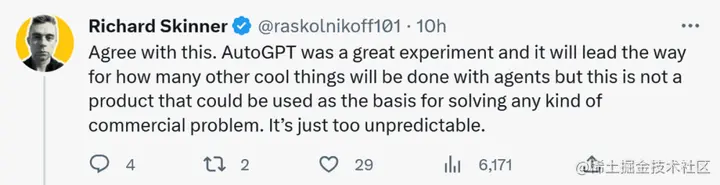 Jim Fan 的观点获得了很多人的赞同。有人认为,「诚然,AutoGPT 是一个伟大的实验,并将引领通过智能体自主完成很多酷炫事情的浪潮。但它不能成为一个可以构筑解决任何商业问题基础的产品,毕竟太不可预测了。」