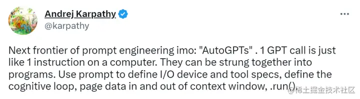 就连前特斯拉 AI 总监、刚刚回归 OpenAI 的 Andrej Karpathy 对此都评价道:「AutoGPT 是 prompt 工程的下一个前沿。」
