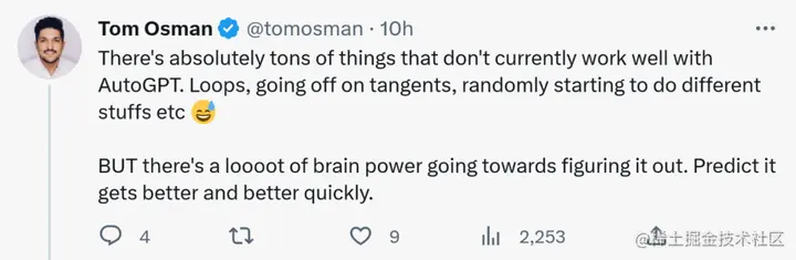 有人从应用的角度剖析 AutoGPT 的不足,目前它虽然无法很好地解决很多事情,比如循环(loop)、切线、随机完成不同的任务。但要弄清楚的是,AutoGPT 需要大量的脑力,预计它会变得越来越好。