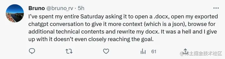光说不练没有说服力,有人现身说法,表示自己整个周六都在让 AutoGPT 打开一个 docx 文档、打开其导出的 ChatGPT 对话以提供更多上下文(json)、浏览其他技术内容并重写 docx 文档。遗憾的是,AutoGPT 甚至都未能接近达成这些目标,还是放弃吧。