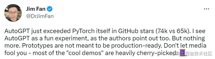 Jim Fan 表示自己仅将 AutoGPT 视为一项有趣的实验,仅此而已,而且这项研究虽然火爆但并不意味着可以投入生产,网上很多酷炫的演示都是精心挑选出来的。