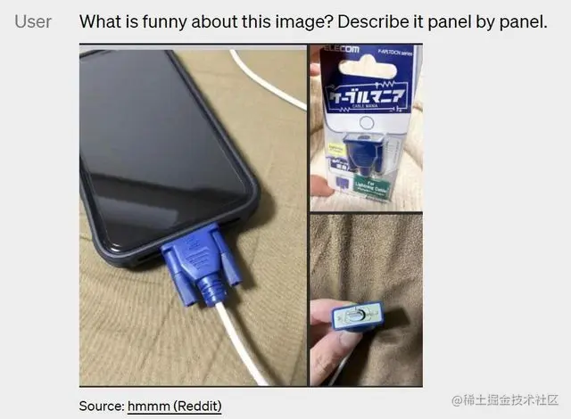 GPT-4 的出现,开始让这些问题变得简单,它能很快的指出图中问题所在:VGA 线充 iPhone。