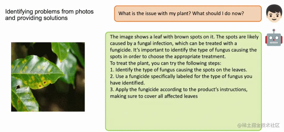 接着,在来看看 MiniGPT-4 图片问答能力。问:「这棵植物出现了什么问题?我该怎么办?」MiniGPT-4 不但指出了问题所在,表示带有棕色斑点的树叶可能由真菌感染引起,并给出了治疗步骤: