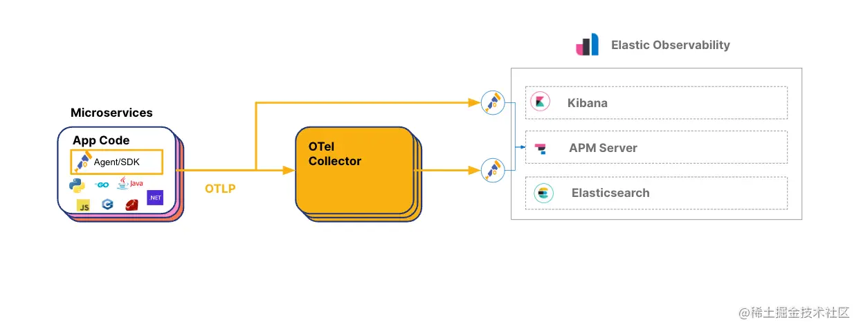 Elastic 原生支持 OTel。 Elastic 用户可以直接从应用程序或通过 OTel 收集器将 OTel 数据发送到 Elastic APM,后者处理 OTel SemConv 和 ECS。 有了这种原生 OTel 支持,所有 Elastic APM 功能都可以通过 OTel 使用。 请参阅 Elastic 文档以了解有关 OTel 集成的更多信息。
