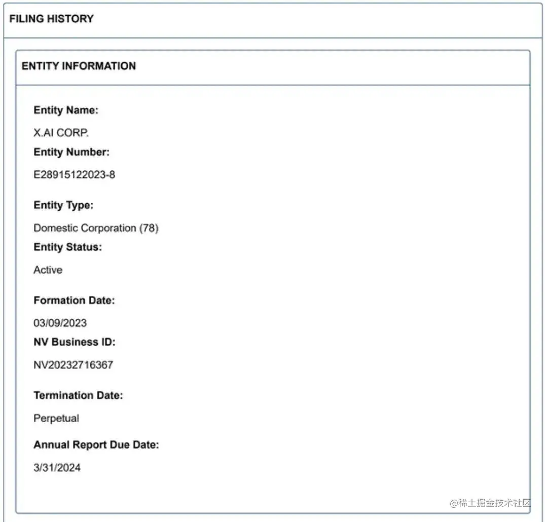 可以确定的是,有一家名叫 X.AI 正在筹划当中:根据一份州备案文件,马斯克上个月在内华达州注册了一家名为 X.AI Corp 的公司。该公司将马斯克列为唯一董事,将马斯克家族办公室的董事总经理 Jared Birchall 列为秘书。