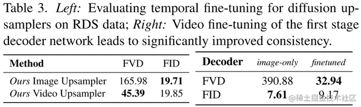 研究者将其视频微调像素空间上采样器与独立逐帧图像上采样做了比较,并使用了 128 × 256 30 fps 的真值视频进行调节,如下表 3 所示。