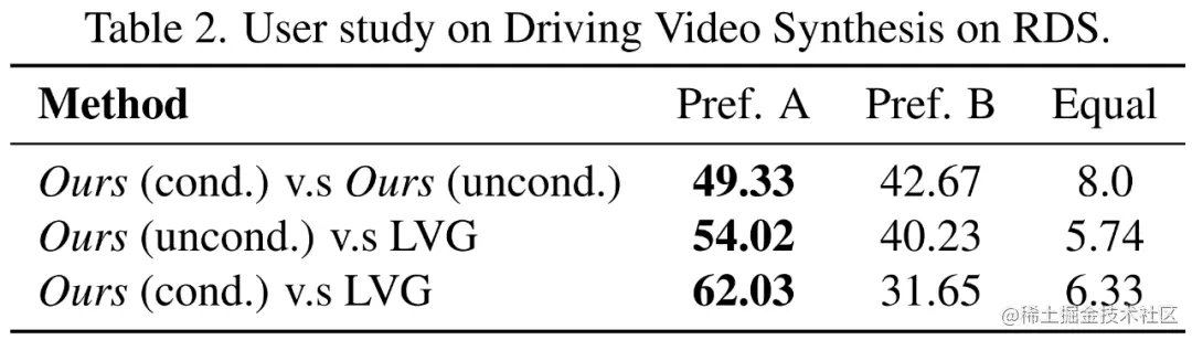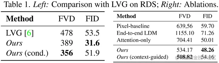 研究者在 RDS 数据集上训练 Video LDM pipeline,包括一个 4 倍像素空间视频上采样器。下表 1 显示了无上采样器时,128×256 分辨率下 Video LDM 的主要结果。研究者展示了有和无拥挤和白天 / 夜晚条件下其模型的性能。可以看到,Video LDM 通常优于 LVG,并且在一定条件下进一步降低了 FVD。