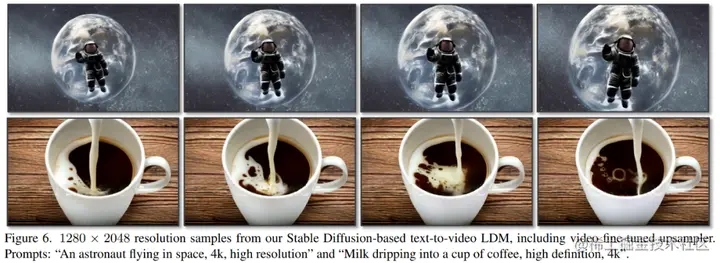 此外,研究者进一步对公开可用的潜在 Stable Diffusion 上采样器进行视频微调,使它支持 4 倍放大并生成分辨率为 1280 × 2048 的视频。研究者生成了由 113 帧组成的视频,并可以渲染成 4.7 秒的 24 fps 或 3.8 秒 30 fps 的片段。相关样本如上图 1 和下图 6 所示。