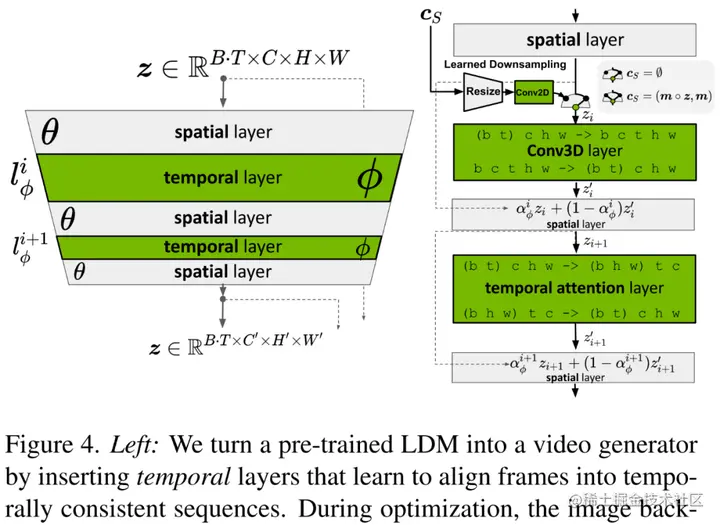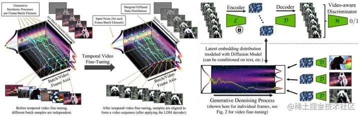 接着将时间维度引入潜在空间 DM、并在编码图像序列(即视频)上仅训练这些时间层的同时固定预训练空间层,从而将 LDM 图像生成器转换为视频生成器(下图左)。最后以类似方式微调 LDM 的解码器以实现像素空间中的时间一致性(下图右)。