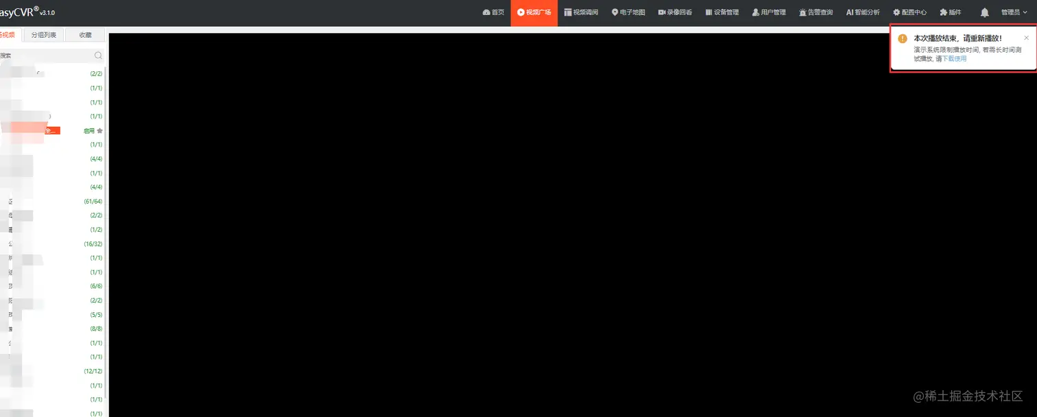 可实现在页面隐藏播放限制时长功能。在ini文件中,将演示平台demo mode由“fale”改成“true”后,此时再登录平台查看,可以发现平台页面已经隐藏了播放限制时长的功能。这样有利于运维人员对平台的管理,节约服务器带宽。