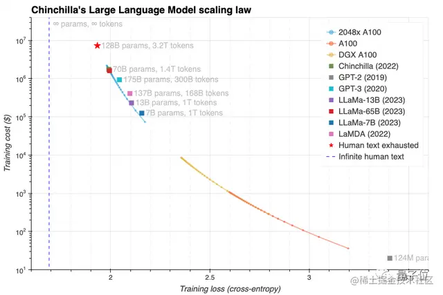 Chinchilla 的研究中发现,此前主流大模型虽数据规模不断扩大但相应的训练量通常不充分,限制了最终效果。