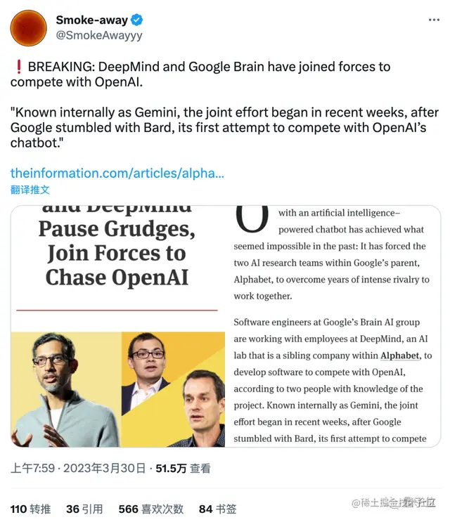 三月底,谷歌的 ChatGPT 竞品 Bard 进展受阻后,又传出谷歌大脑与 DeepMind 在新的大模型项目双子星(Gemini)上合作,这次要直接对标 GPT-4。