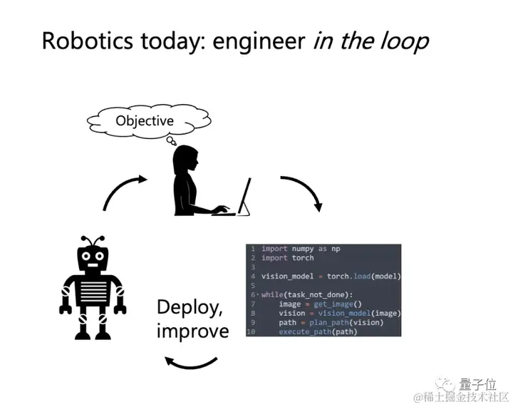 工程师需要在工作流程回路中,不断手写新代码和规范来纠正机器人行为;另外,操控不同的机器人可能需要不同的编程语言和环境。
