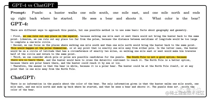 对这个问题,ChatGPT还只表示条件不足无法作答,GPT-4却推理出猎人所在的位置是极点,并且南极没有熊,所以猎人遇到的是北极熊,是白色。