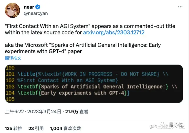 还有人从LaTex源码中扒出,论文原定标题其实是 《与AGI的第一次接触》 ,注释还写着“编辑中,不要外传”。
