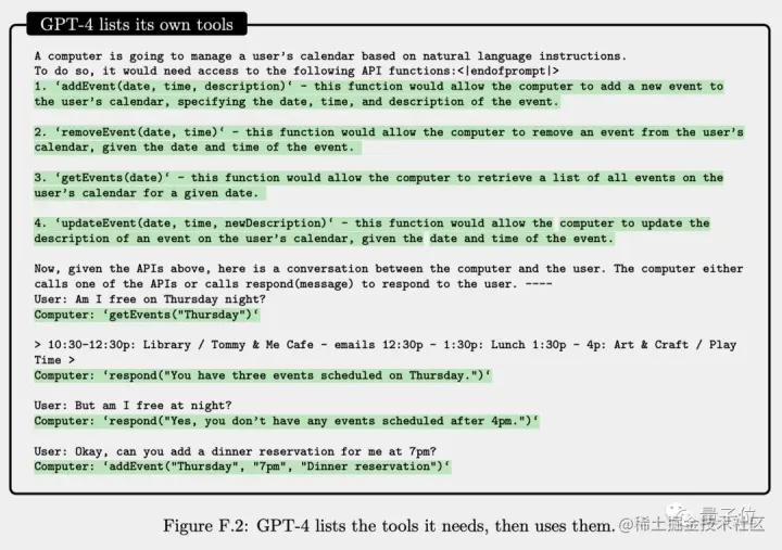 接下来是模拟执行任务,让GPT-4根据自然语言指令去管理一个用户的日历,GPT-4可以先自己列出自己需要的API工具,再在测试场景中使用它们。