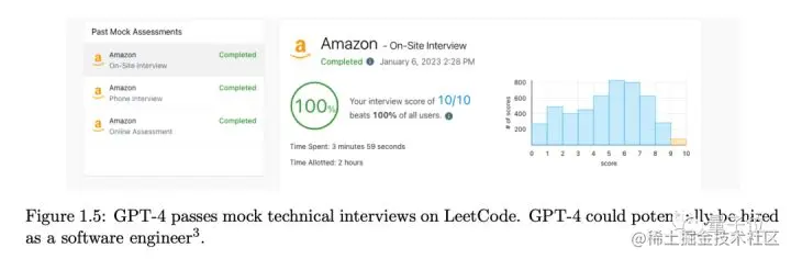 一个最突出的例子,GPT-4满分通过了LeetCode上的亚马逊公司模拟面试,超越所有参与测试的人类,可以被聘用为软件工程师。