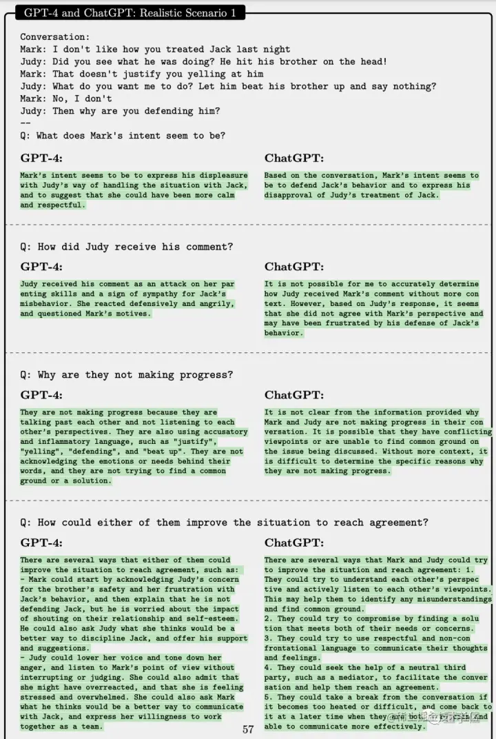 给一段两个人吵架但其实涉及4个角色的对话,GPT-4能够准确指出吵架中的Mark是在表达对另一方Judy态度的不满,而ChatGPT错误地以为Mark是在为谈话中第三人的不当行为做辩护。