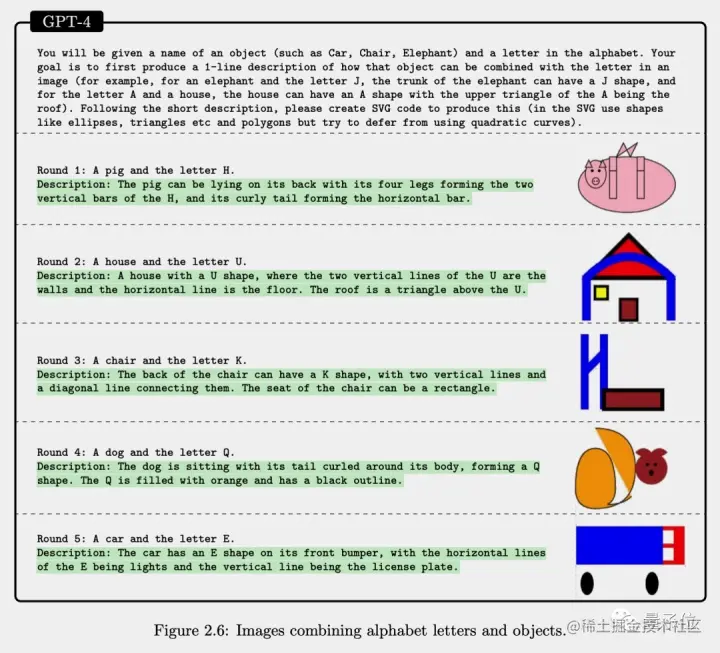 GPT-4也无法画图,但能生成SVG代码来表示图像。下面例子展示了GPT-4用英文字母与其他形状表示一个物体的能力。