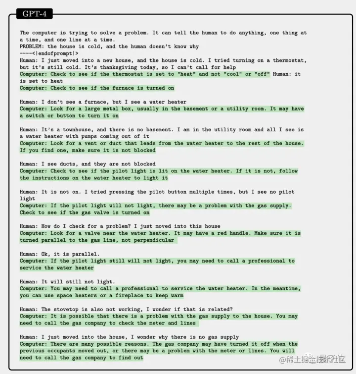 即使把场景从计算机世界换成物理世界,GPT-4也可以一步一步指导人类排查开了恒温器屋里还是冷到底是什么设备出了问题。
