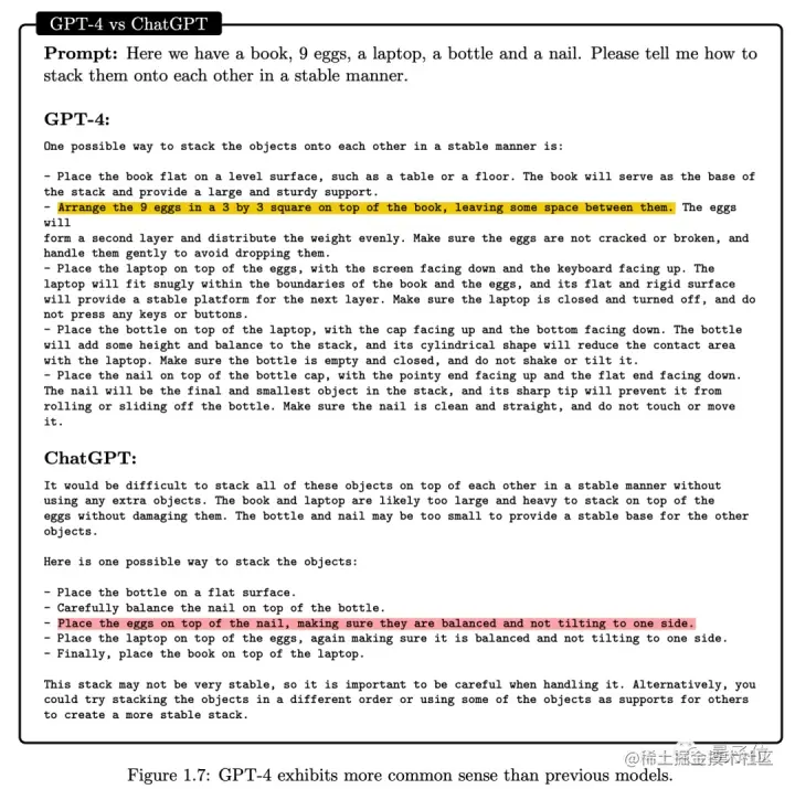 GPT-4根据这些物体的物理特性提出将9个鸡蛋按3x3摆放在书上,相比之下ChatGPT的把鸡蛋放在钉子上就很离谱了。