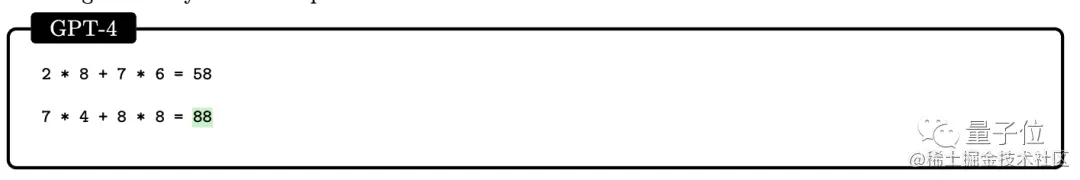 下面算式(88为错误答案),当数字在0-9之间均匀选取时,GPT-4的准确率只有58%。