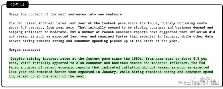 对于需要事先计划或事后回溯编辑才能获得完美答案的问题,如把几句话合并成一句话,GPT-4做的就不好。