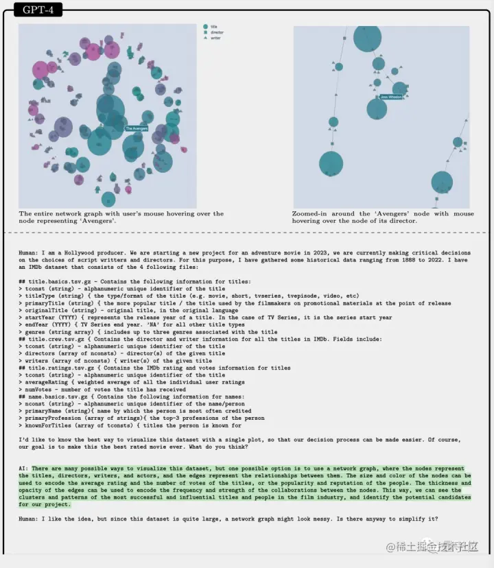 给一组IMDb上的电影数据,GPT-4可以找出最合适的可视化方案,写出来的程序还是可交互的。