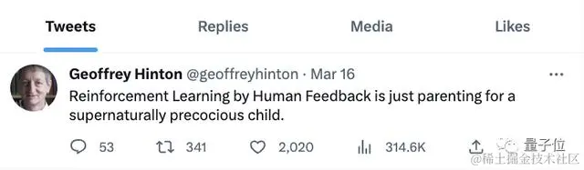至于Hinton还忙着追赶,他的社交平台还停留在15日,称RLHF机制是在催熟AI。