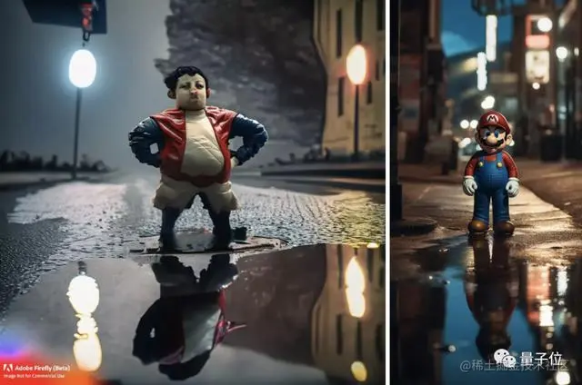一张照片捕捉到超级马里奥在昏暗的街道上摆pose,在地上的水坑里有一个大倒影,空气中有轻微的薄雾,你知道某些事情即将发生,人们对此充满期待。这就像好莱坞电影中的场景,高产值,拟人化的镜头。