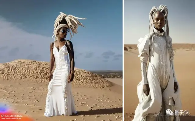 乍看一眼,两个都还行,但稍微瞧瞧就会发现Firefly给了个男扮女装的形象,手部废了,背景相比MidJourney还是输了一截。不过两者这个“白色辫子”的呈现就大哥不说二哥了。