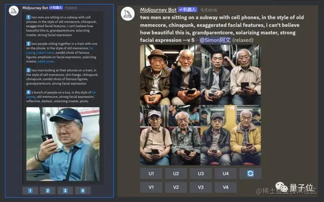 不过,直接用它给出的描述再生成图,会跟原图有些差别,比如设计美学博主@Simon_阿文尝试的这个“地铁老人看手机”梗图: