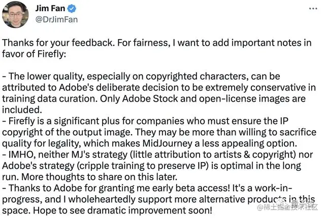 恕我直言,从长远来看,MidJourney的策略(几乎不关注艺术家和版权)和Adobe的策略(为了保护知识产权削弱训练)都不是最优的。