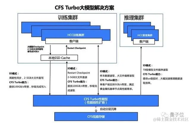 CFS Turbo高性能并行文件存储方案,采取多级缓存加速,基于全分布式架构,提供100GB/s带宽、1000万IOPS的极致性能。并通过持久化客户端缓存技术,将裸金属服务器本地NVMe SSD和Turbo文件系统构成统一命名空间,实现微秒级延时,解決大模型场景大数据量、高带宽、低延时的诉求。