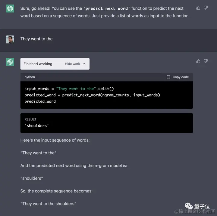 具体来说,就是给出一半的句子,让AI预测下一个词,ChatGPT很快给出了代码: