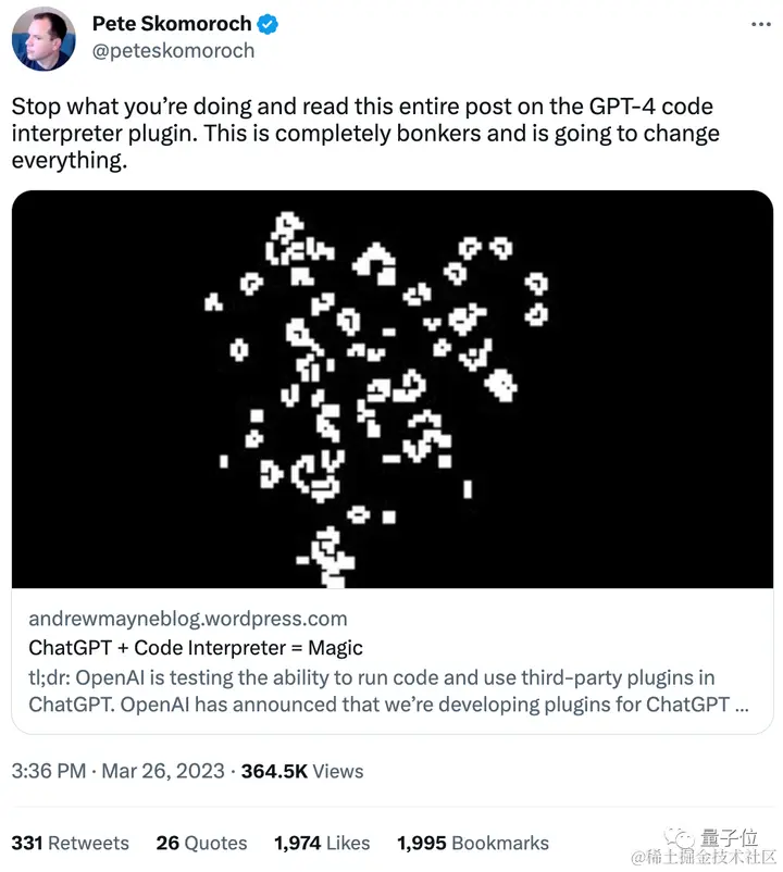 有网友看完后表示,代码解释器插件很好地填补了ChatGPT“数学差”的漏洞: