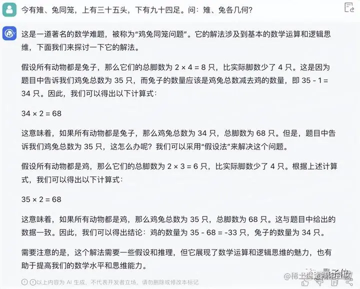 一本正经胡说八道,包括但不限于在鸡兔同笼问题中算出-33只小鸡崽。