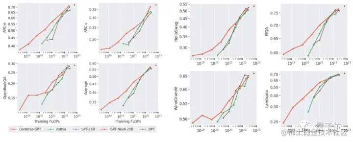 可以看出,在最终性能相差不大的情况下,Cerebras-GPT的训练效率要更高一些。