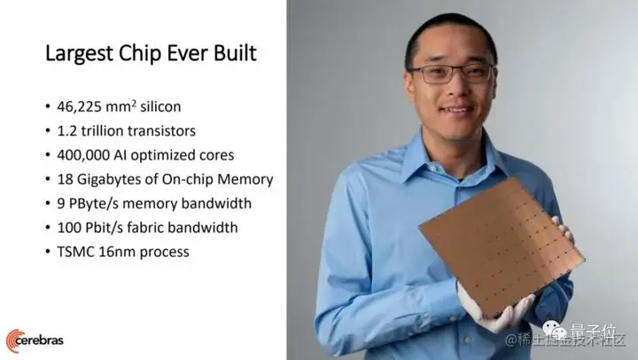 芯片面积最大:尺寸约20厘米×23厘米,总面积46,225平方毫米。面积和一块晶圆差不多。