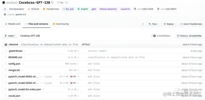 据Cerebras公司表示,他们开放出来的模型不仅包含数据集,可用于研究也可商用,而且关键是预训练模型权重开放(从下图来看文件大小近50G)。