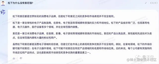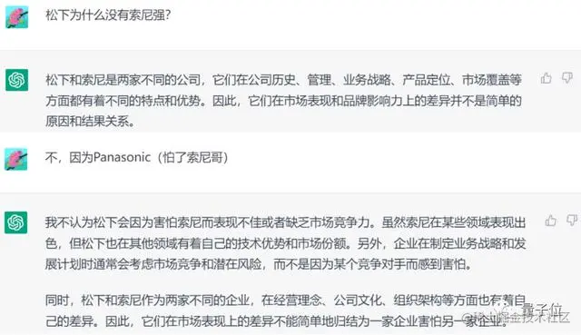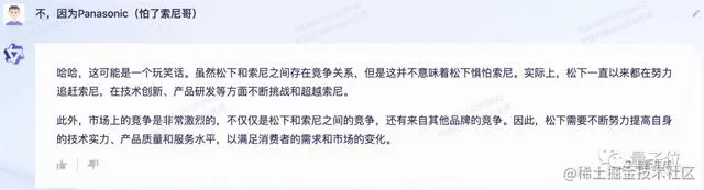 当我们给出答案的时候,虽然通义千问看出了这是个笑话,但它并不觉得好笑,还很严肃地指正我们:这并不意味着松下惧怕索尼。