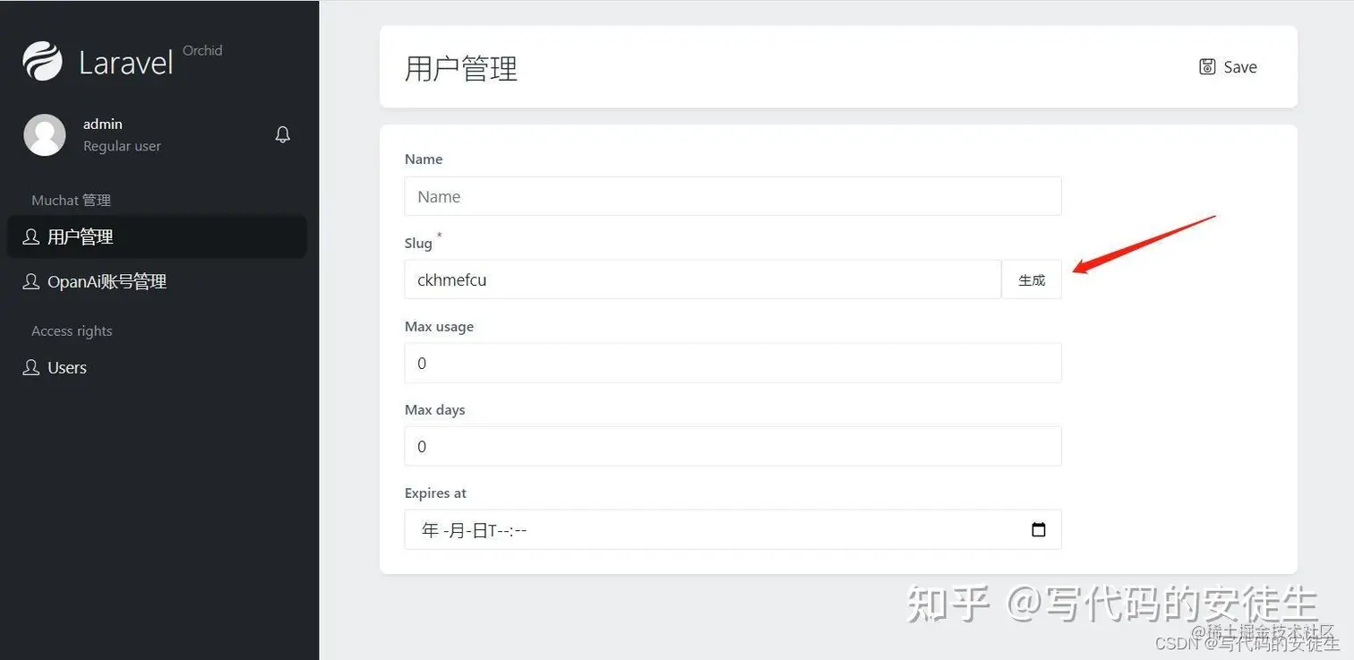 单击【生成】自动生成 slug 作为用户登录的唯一凭证(即激活码)