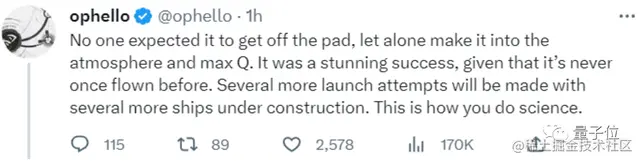 同样,官方推特也表示,无论如何,“成功来自我们学到的东西”,“今天的测试将帮助我们提高星舰的可靠性”。